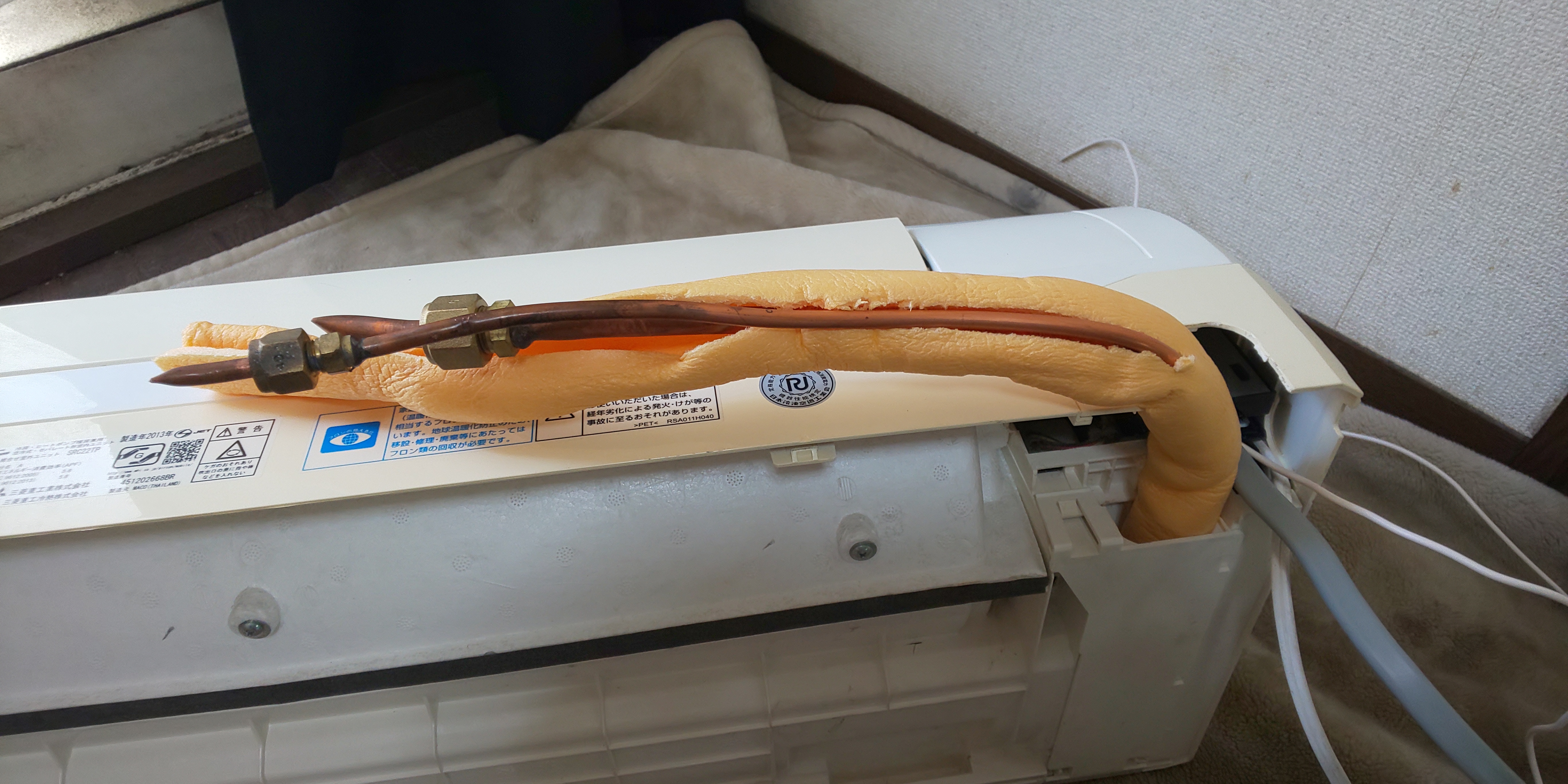 エアコンの室内機から10円玉の色をした銅の細い管、太い管があります。これが『潰れている・折れている』物を選んではいけません。ガス詰まり、配管が折れてガス漏れ、腐食など様々な不具合の原因となります。