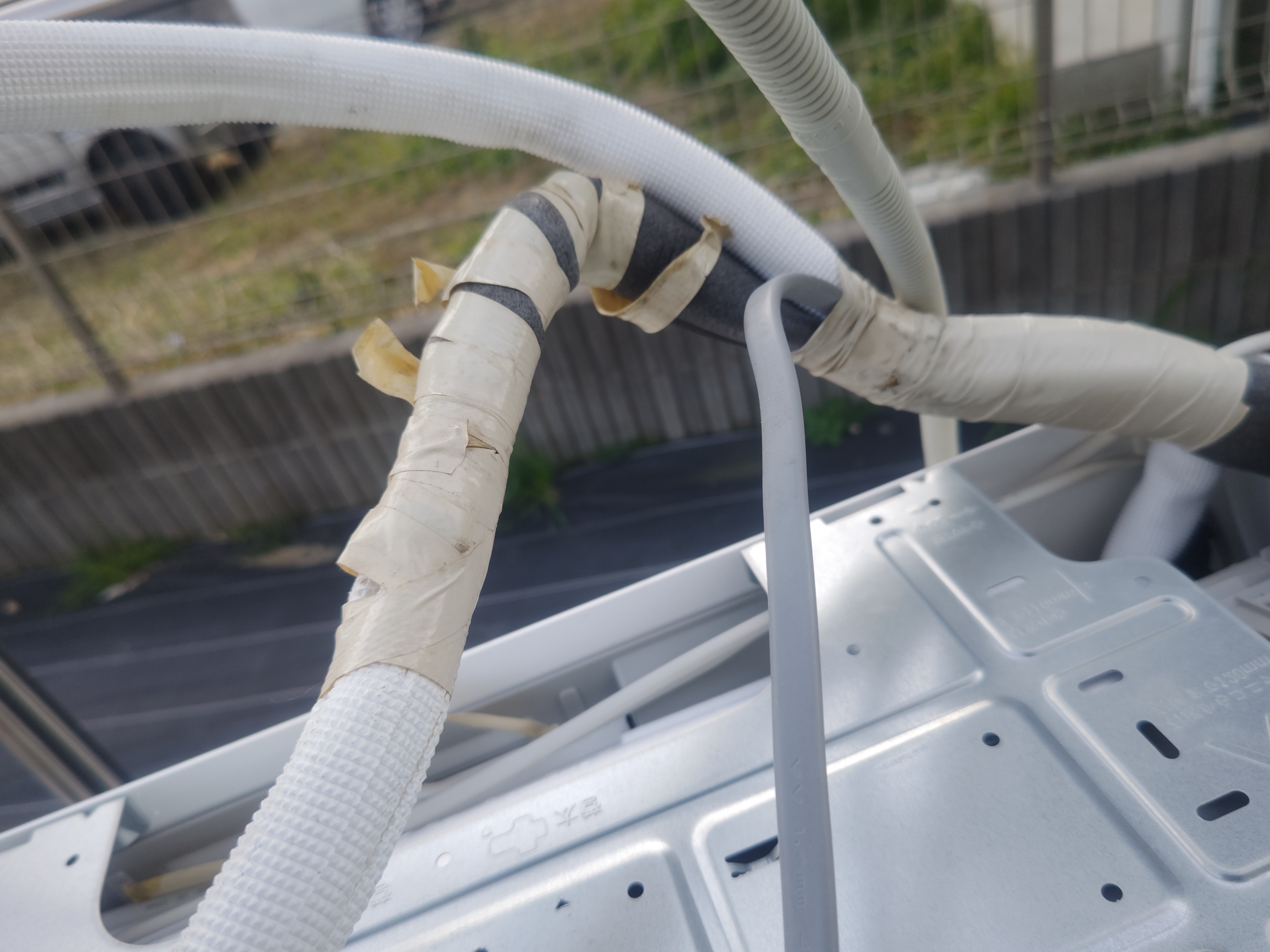 配管はぐちゃぐちゃ。エアコンの室内機は室外機の上にドン。と置かれて傷ができています。しかもこの部分、