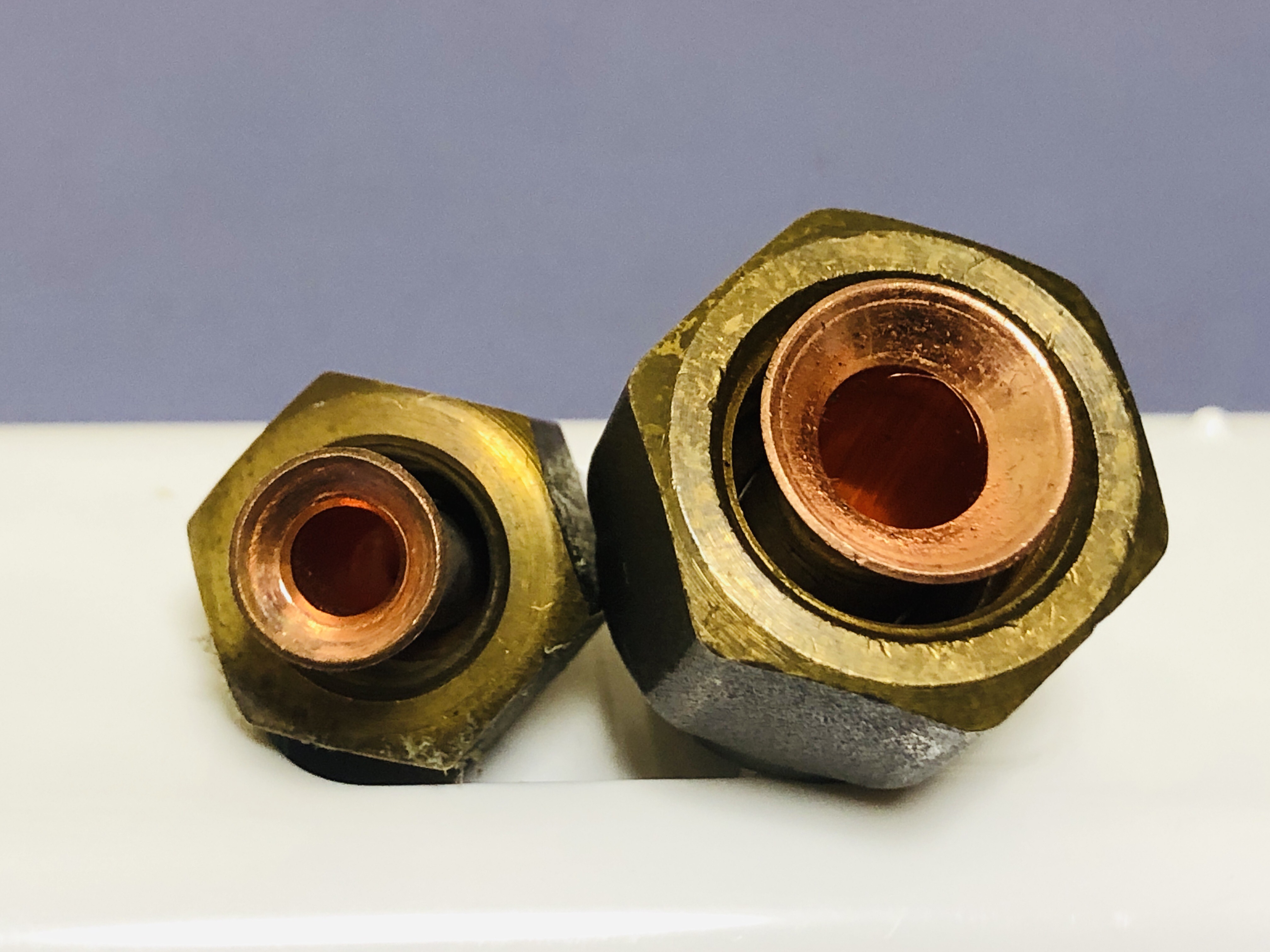 その中でも、エアコン工事で大切な工程の一つ、フレア加工というものがあります。この画像を見て下さい。左右で穴をよくみてもらうと、右の大きな方は、右上の部分に『バリ』と言われる金属くずが残っているのがわかりますか?穴の中というか、割と際の部分です。