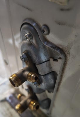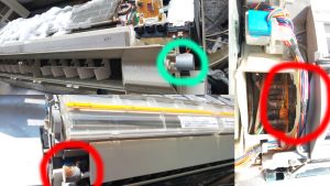 室外機の右側にカバーが付いています。そのカバーを外すと写真のような感じになっています。ここを触った時にベタベタしている、ヌルヌルしている、なにかテカテカ光っているなど、【オイル】が付いている感じがしたら、エアコンの室外機から『ガスが漏れている』事になります。