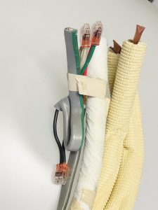 左のグレーの部分が電気が流れる電線なのですが、だいぶ窮屈に曲がっているように見えます。Niteでは火事の恐れがあるのでやめて下さい。というタイプです。当店では、見た目よりも『長く安全に使える工事』を目指していますので、仕上がりが家電量販店よりも汚いです。家電量販店の下請けを抜けたのは、いつか火事が起こって責任を取らされるのではないか?と思ったからです。綺麗につけるなら誰でもできます。安全につけるのは経験と知識がある業者でしかできません。