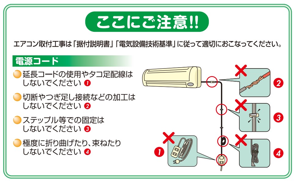 実はエアコン工事で気になるのが『電源コード』の束ね方。このNiteに聞いていました。結果は、極度に折り曲げたりはやめて下さい。という事でした。経済産業省のリンクを教えてもらったので合わせてリンクを設置します。