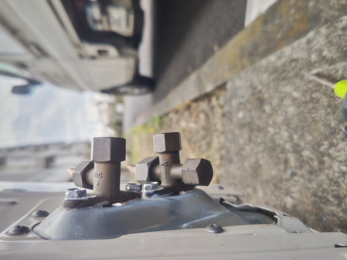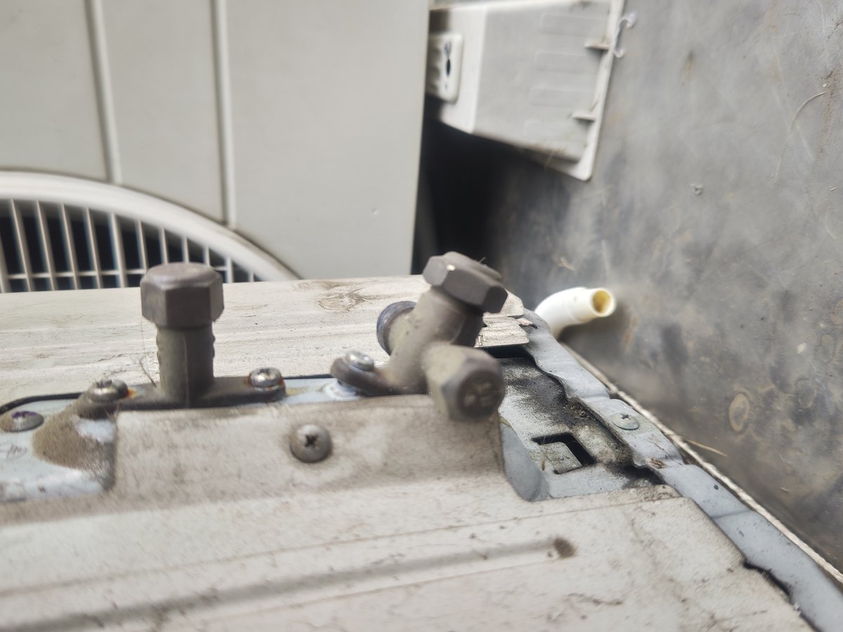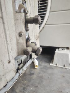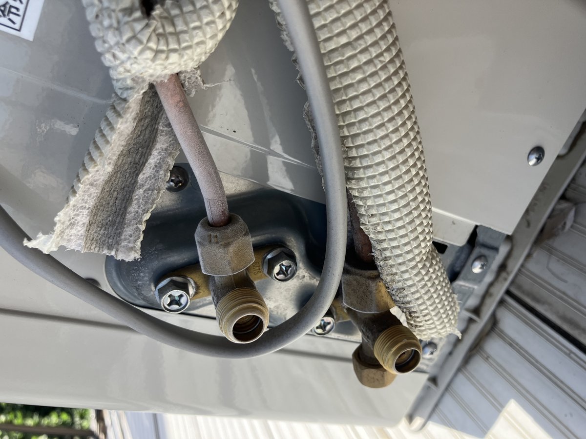 買取に行ったとき、一目見ておかしいことに気が付きました。上から見ると、少し配管が歪んで見えたんです。なので、工事前に【買取ができない】ことをお伝えしました。また、すでに隙間からエアコンのオイルが漏れ出ている箇所もあり、取り外し工事をすると室外機からすでに漏れているオイルがこぼれてしまう事などを予めお伝えしたのち、取り外しをさせて頂きました。