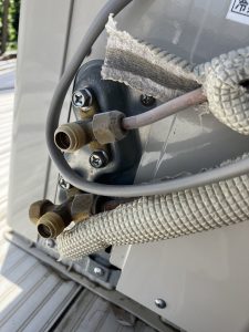 冷房運転で室外機の横から出ている配管を見てみると、このように白く凍り付いてしまう事があります。取り付け業者が下手なせいで去年買ったエアコンでもこのような症状が出ることがあります。20年前のエアコンでもガス漏れしていない機種はしていないので、基本的にガスは漏れません。取り付けの時に何かしたんでしょうね。