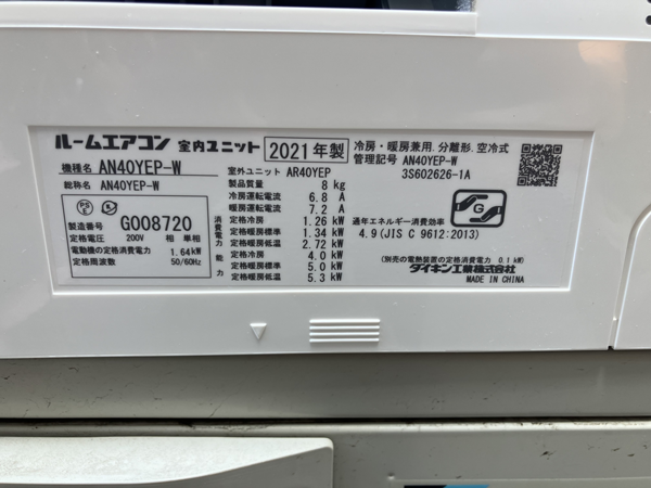 こちらのエアコンはダイキンのルームエアコンになります。当店では家庭用ルームエアコンの買取を強化しています。特にダイキン製は古い機種、製造10年経過、15年前くらいまでの古い機種でも、2台以上あれば取り外し工事などの諸費用込みで無料回収、もしくは買取ができる可能性が高いです。当店では標準設置のエアコンの取り外し工事費用は無料ですので、ぜひエアコンを売るときはご相談ください。