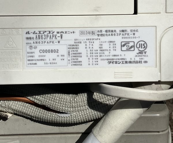 取り外して駐車場に置いてある状態で、付属品は全てそろっている。という状態でした。まず、取り外しされていると動作確認ができなくなります。なので、ジャンク品の査定となります。また、製造10年以上経過しているので、まだ動いたとしても、ジャンク品扱いになり、買取価格は5,000円となり変わりません。むしろ、設置環境が悪いと取り外し費用が発生しますのでどっちみちジャンク品であれば、取り外して置いてある方がいいに決まってます。付属品はリモコンと配管、背板、室内機、室外機の5つ。すべて揃っていますので、減額にもなりません。