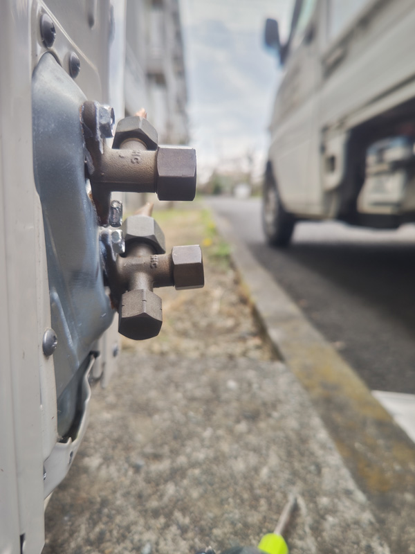 今回のエアコンはポンプダウンをしようと捜査したところ、液化ガスがブクブクと溢れてきてしまいました。