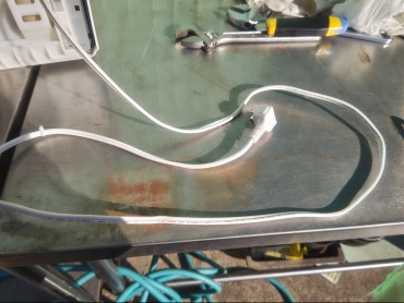 折れてしまうほどきつく締めあげていたようです。これはK電気で購入されたと言っていました。2012年。ちなみにアース工事もされていませんでした。内線規程違反ですね。団地のベランダ置きで雨でぐっしょり。
